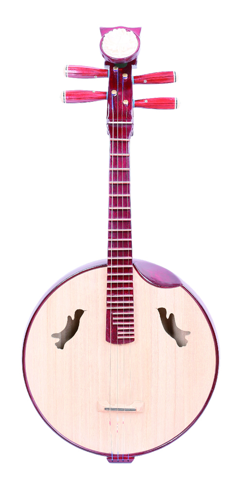 民族乐器--阮 材质:琴头:精选牛骨雕刻牡丹花,美观大方。琴轴:雕刻成麻花辨的六瓣琴轴